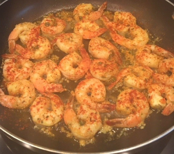 Transport the shrimps to a glass dish and thaw it overnight in the fridge. Next day, mix the shrimps with all the other ingredients but the olive oil. Keep in the fridge for couple of hours. Turn on the oven to medium high heat. In a pan, heat the oil, and then add the shrimps mix. Cook each side for 2-3 min. or until the shrimp is not translucent anymore.